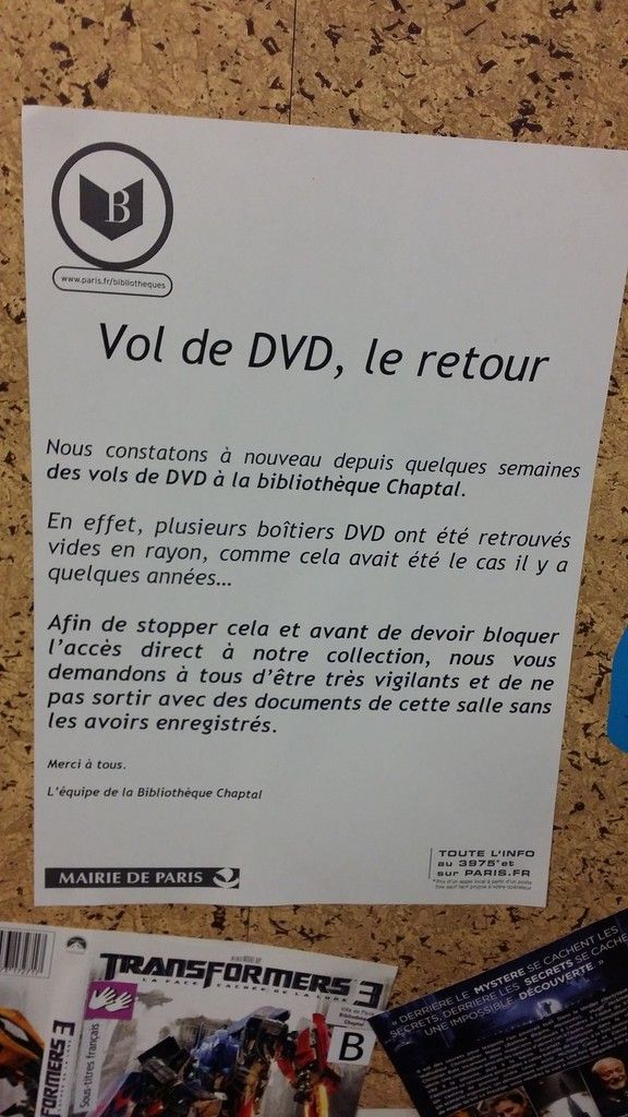 « Nous constatons à nouveau depuis quelques semaines des vols de DVD à la bibliothèque Chaptal. En effet, plusieurs boitiers de DVD ont été retrouvés vide en rayon, comme cela avait été le cas il y a quelques années ». C’est par cette affichette qu'ont été cueillis les usagers de cette bibliothèque située dans le quartier de la Nouvelle Athènes dans le IXeme arrondissement de Paris. Des actes de malveillance qui coûtent cher à l’établissement. D’autant plus que les achats des DVD par les bibliothèques municipales ne correspondent pas au prix public des titres acquis, mais sont bien plus onéreux en raison du droit de prêt.